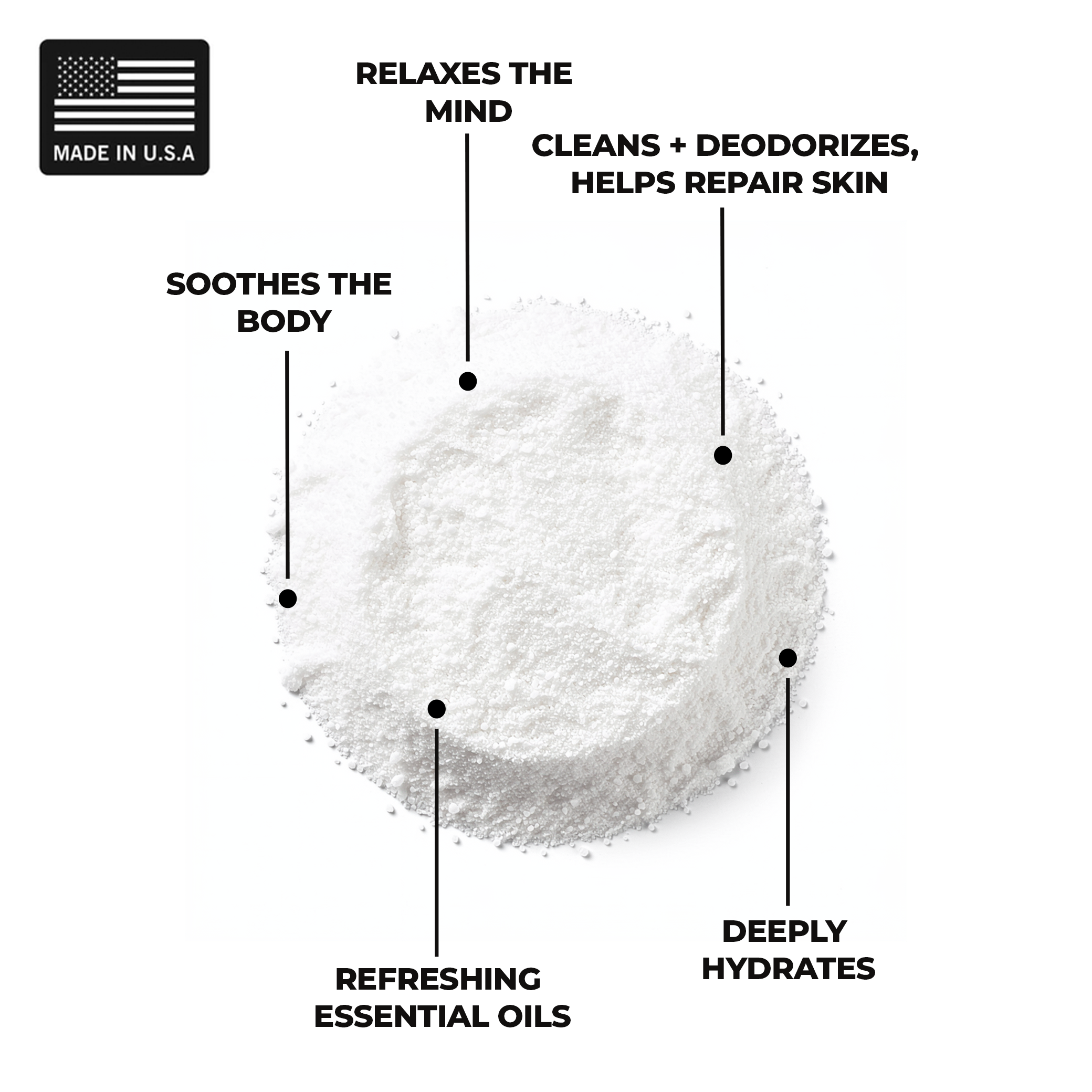 Dead Sea Salt, Sodium Bicarbonate, Citric Acid,Eucalyptus oil, Rosemary oil, Peppermint oil, Spearmint oil